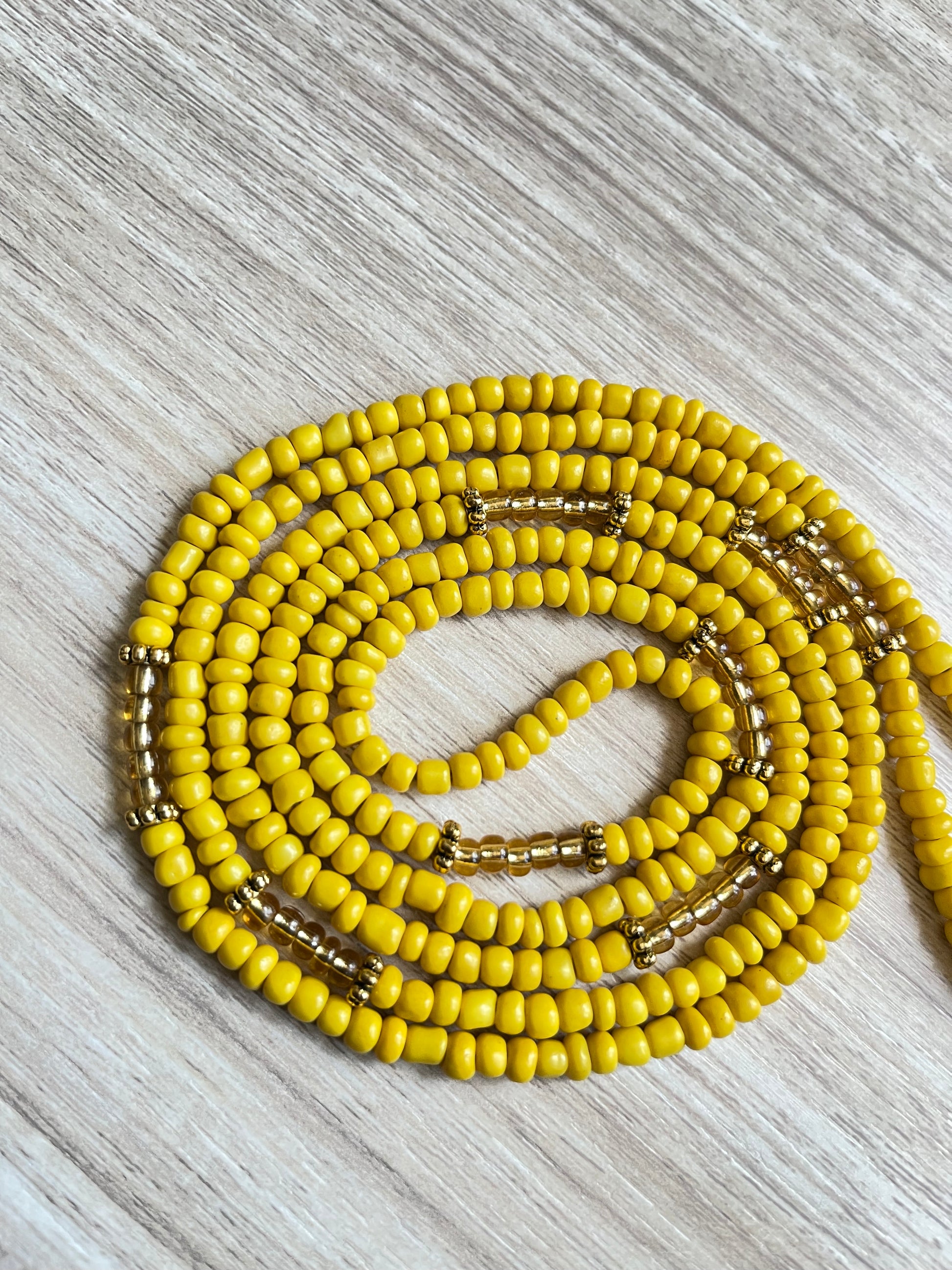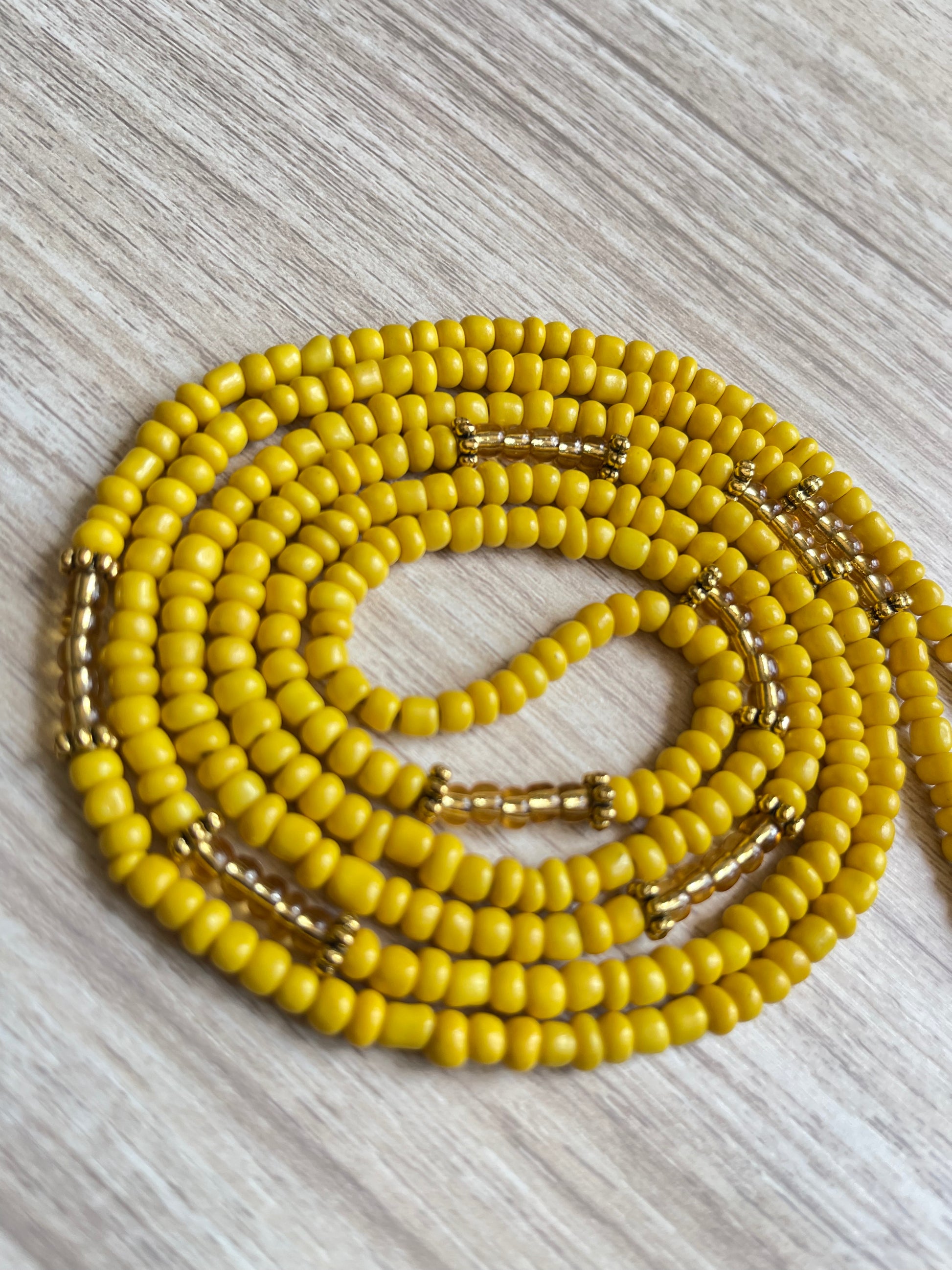 This waist bead is well constructed with 6/0 glass seed beads ranging in the gold & yellow family.
